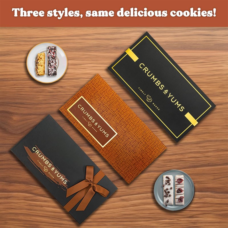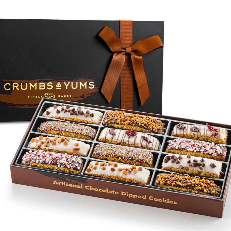 - GOURMET CHOCOLATE-COVERED BISCOTTI: Crumbs & Yums Modern Basket features 12 handcrafted biscotti in six exquisite flavors: caramel chips, chocolate chips, nut crunch, dried cranberries, crushed peppermint, and rainbow sprinkles, offering a luxurious and rich treat.