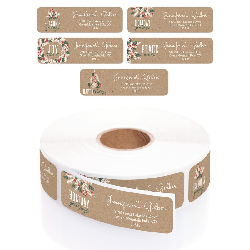 Holiday Faux Kraft Rolled Address Labels/Roll of 250 Personalized Return Address Labels/Designer Return Address Stickers in Elegant Plastic Dispenser