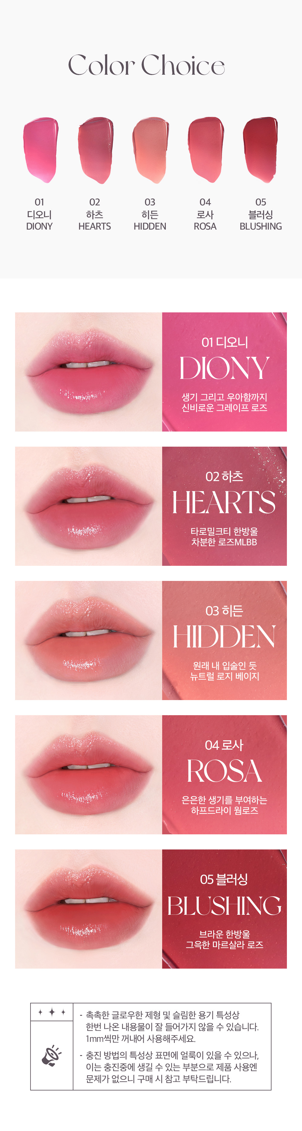 - All ingredients: 01 Diony Caprylic/Capric Triglyceride, Hydrogenated Polyisobutene, Octyldodecanol, Dipentaerythrityl Pentaisostearate, Phytosteryl/Behenyl/Octyldodecyllauroyl Glutamate, Synthetic Wax, Phytosteryl/isostearyl/cetyl/stearyl/behenyl dimer dilinoleate, paraffin, glycerin, synthetic fluorophlogopite, diglyceryl sebacate/isopalmitate, ethylhexyl hydroxystearate, diisoste. Aryl maleate, titanium dioxide (CI 77891), safflower seed oil, apple seed oil, cupuaçu seed butter, butylene glycol, sorbitan isostearate, lauryl PEG-9 polydimethylsiloxyethyldimethicone , ethylene/propylene copolymer, polyethylene, stearalkonium hectorite, polyhydroxystearic acid, microcrystalline wax, polyglyceryl-2 triisostearate, cetyl PEG/PPPG-10/1 dimethicone. , propylene carbonate, ethylhexyl palmitate, isopropyl myristate, isostearic acid, lecithin, polyglyceryl-3 polyricinoleate, polyglyceryl-2 diisostearate, tocopherol, fragrance, yellow iron oxide (CI 77492 ), Red No. 227 (CI 17200), Black Iron Oxide (CI 77499), Yellow No. 5 (CI 15985), Blue No. 1 (CI 42090), Red Iron Oxide (CI 77491), Red No. 202 (CI 15850), Red 104 Favor (1) (CI 45410), Blue No. 1 (CI 42090) 02 Hearts Caprylic/Capric Triglyceride, Hydrogenated Polyisobutene, Octyldodecanol, Dipentaerythritylpentaisostearate, Phyto Steryl/behenyl/octyldodecyllauroylglutamate, synthetic wax, phytosteryl/isostearyl/cetyl/stearyl/behenyl dimer dilinoleate, paraffin, glycerin, synthetic fluorophlogopite, diisostearyl Malate, titanium dioxide (CI 77891), diglyceryl sebacate/isopalmitate, safflower seed oil, apple seed oil, cupua fruit seed butter, butylene glycol, sorbitan isostearate, lauryl PEG-9 Polydimethylsiloxyethyldimethicone, ethylene/propylene copolymer, ethylhexylhydroxystearate, polyglyceryl-2 triisostearate, polyethylene, stearalkonium hectorite, polyhydroxystearic acid, microcrystal Lean wax, cetyl PEG/PPG-10/1 dimethicone, propylene carbonate, polyglyceryl-2 diisostearate, ethylhexyl palmitate, isopropyl myristate, isostearic acid, lecithin, polyglyceryl -3 Polyricinoleate, tocopherol, fragrance, yellow iron oxide (CI 77492), yellow No. 5 (CI 15985), red No. 202 (CI 15850), blue No. 1 (CI 42090), red No. 227 (CI 17200) 03 Hidden caprylic/capric triglyceride, hydrogenated polyisobutene, octyldodecanol, dipentaerythritylpentaisostearate, phytosteryl/behenyl/octyldodecyllauroyl glutamate, synthetic wax, phyto Steryl/isostearyl/cetyl/stearyl/behenyl dimer dilinoleate, paraffin, glycerin, synthetic fluorophlogopite, diglyceryl sebacate/isopalmitate, diisostearyl maleate, titanium dioxide (CI) 77891), safflower seed oil, apple seed oil, cupuaçu seed butter, butylene glycol, cetyl PEG/PPG-10/1 dimethicone, sorbitan isostearate, ethylene/propylene copolymer, ethylhexylhyde Roxystearate, polyglyceryl-2 triisostearate, polyethylene, lauryl PEG-9 polydimethylsiloxyethyldimethicone, stearalkonium hectorite, polyhydroxystearic acid, microcrystalline wax, Propylene carbonate, ethylhexyl palmitate, isopropyl myristate, isostearic acid, lecithin, polyglyceryl-3 polyricinoleate, polyglyceryl-2 diisostearate, tocopherol, fragrance, yellow iron oxide (CI 77492) , Yellow No. 5 (CI 15985), Black Iron Oxide (CI 77499), Blue No. 1 (CI 42090), Red Iron Oxide (CI 77491), Red No. 227 (CI 17200), Red No. 202 (CI 15850), Yellow No. 4 (CI 19140) 04 Rosa Caprylic/Capric Triglyceride, Hydrogenated Polyisobutene, Octyldodecanol, Dipentaerythritylpentaisostearate, Phytosteryl/Behenyl/Octyldodecyllauroyl Glutamate , synthetic wax, phytosteryl/isostearyl/cetyl/stearyl/behenyl dimer dilinoleate, paraffin, glycerin, synthetic fluorophlogopite, diisostearyl maleate, diglyceryl sebacate/isopalmitate. , titanium dioxide (CI 77891), ethylhexyl hydroxystearate, safflower seed oil, apple seed oil, cupuaçu seed butter, butylene glycol, sorbitan isostearate, lauryl PEG-9 polydimethylsiloxy. Ethyl dimethicone, ethylene/propylene copolymer, polyglyceryl-2 triisostearate, polyethylene, stearalkonium hectorite, polyhydroxystearic acid, microcrystalline wax, cetyl PEG/PP-10/ 1 Dimethicone, propylene carbonate, ethylhexyl palmitate, isopropyl myristate, isostearic acid, lecithin, polyglyceryl-3 polyricinoleate, tocopherol, fragrance, yellow iron oxide (CI 77492), red No. 227 ( CI 17200), Yellow No. 5 (CI 15985), Black Iron Oxide (CI 77499) 05 Blushing Caprylic/Capric Triglyceride, Hydrogenated Polyisobutene, Octyldodecanol, Dipentaerythritylpentaisostea Latex, phytosteryl/behenyl/octyldodecyllauroyl glutamate, synthetic wax, phytosteryl/isostearyl/cetyl/stearyl/behenyl dimer dilinoleate, paraffin, glycerin, synthetic fluorophlogopite, die Glyceryl sebacate/isopalmitate, diisostearyl malate, ethylhexyl hydroxystearate, safflower seed oil, apple seed oil, cupua fruit butter, butylene glycol, sorbitan isostearate, lauryl pea. Easy-9 polydimethylsiloxyethyldimethicone, ethylene/propylene copolymer, polyglyceryl-2 triisostearate, polyethylene, stearalkonium hectorite, polyhydroxystearic acid, microcrystalline wax, poly Glyceryl-2 diisostearate, cetyl PEG/PPG-10/1 dimethicone, propylene carbonate, ethylhexyl palmitate, isopropyl myristate, isostearic acid, lecithin, polyglyceryl-3 polylysy. Noliate, tocopherol, fragrance, titanium dioxide (CI 77891), red No. 202 (CI 15850), yellow iron oxide (CI 77492), yellow No. 5 (CI 15985), blue No. 1 (CI 42090), red iron oxide (CI 77491) ), yellow No. 4 (CI 19140), black iron oxide (CI 77499), red No. 104 (1) (CI 45410)