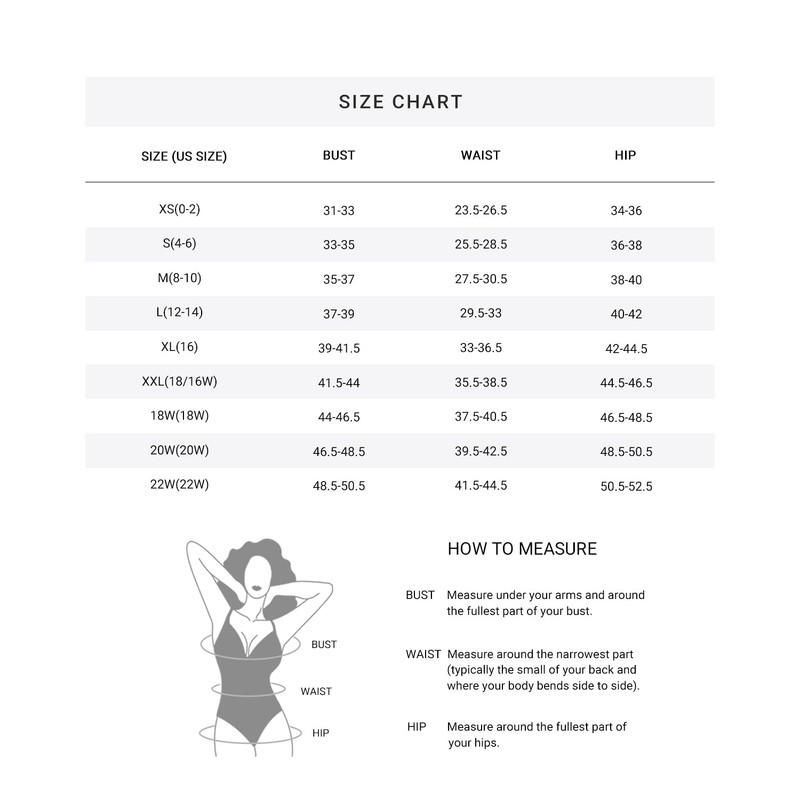 - Tamaño: para lograr el ajuste perfecto, primero toma las medidas precisas y luego consulta nuestra tabla de tallas cuidadosamente elaborada para adaptarse a nuestros diseños de trajes de baño. Los tamaños disponibles son: S (EE.UU. 4-6), M (EE.UU. 8-10), L (EE.UU. 12-14), XL (EE.UU. 16), XXL (EE.UU. 18), 18 Plus (EE.UU. 18W), 20 Plus (EE.UU. 20W) y 22 Plus (EE.UU. 22W).