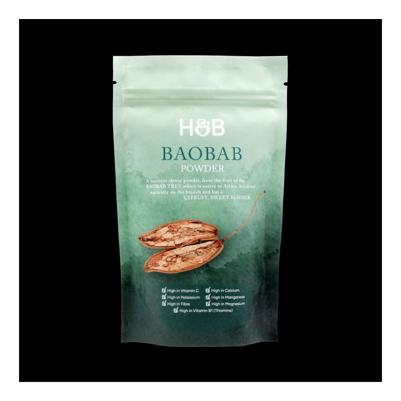 This citrusy baobab powder is made from the fruit of the baobab tree, which is native to Africa. It is high in vitamin C, fibre, calcium, potassium, magnesium, manganese and vitamin B1 (thiamine). The baobab fruit is one of the most nutrient-dense foods in the world. It dries naturally on the branches of the tree and is then ground into a nutrient-dense powder that offers a sweet taste.