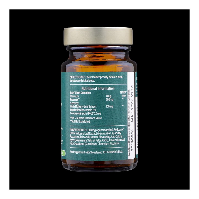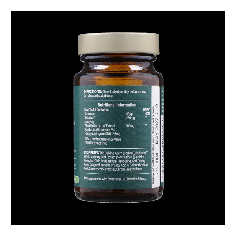 Each tasty tablet is packed with 40µg of chromium, an essential mineral that contributes to the maintenance of normal blood glucose levels and helps your body metabolise macronutrients (that’s carbs, fats and proteins to you and me). We’ve also added 250mg of scientifically studied Reducose®, a white mulberry leaf extract.