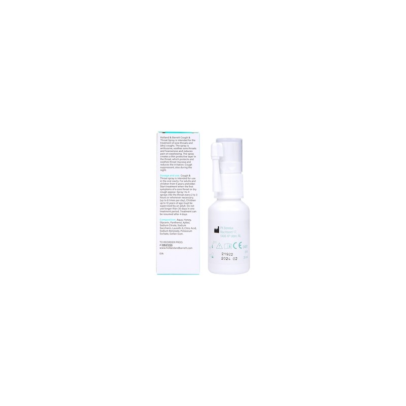 Holland & Barrett Cough and Throat Spray is intended for the treatment of sore throats and tickling, dry coughs.