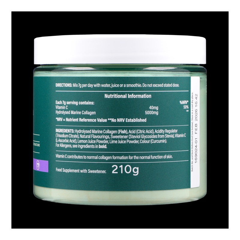 Hydrolysed Marine Collagen (Fish), Acid (Citric Acid), Acidity Regulator (Trisodium Citrate), Natural Flavouring, Natural Flavouring, Lemon Juice Powder, Lime Juice Powder , Sweetener (Steviol Glycosides from Stevia), Vitamin C (L-Ascorbic Acid), Colour (Curcumin). For Allergens, see ingredients in bold.