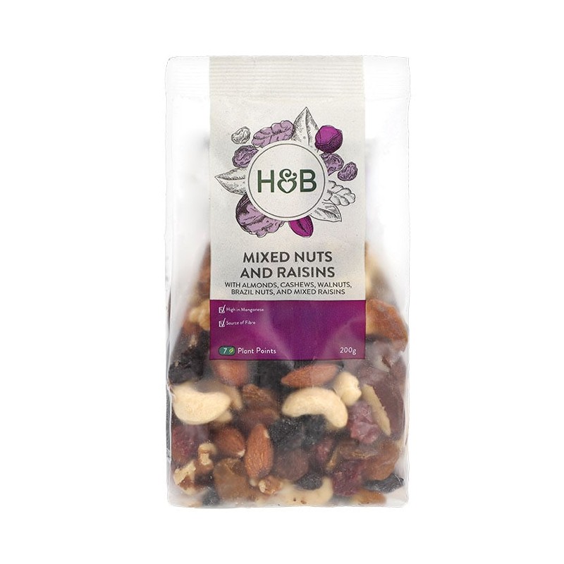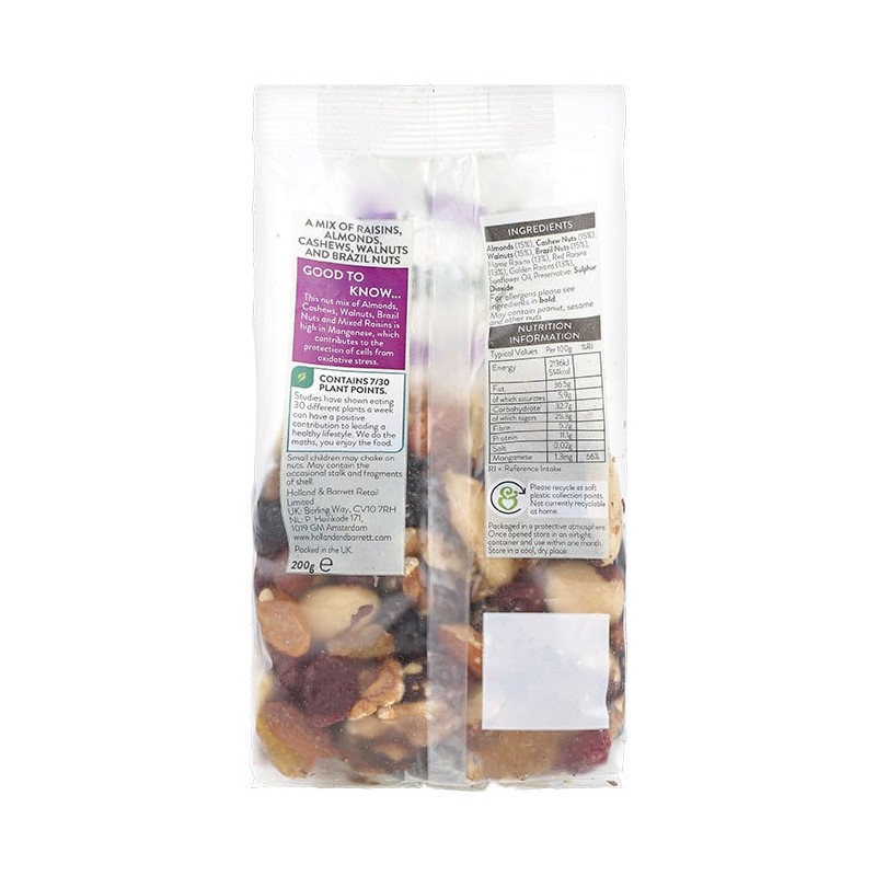 Holland & Barrett Mixed Nuts and Raisins contain a mix of almonds, cashews, walnuts, Brazil nuts and mixed Raisins.