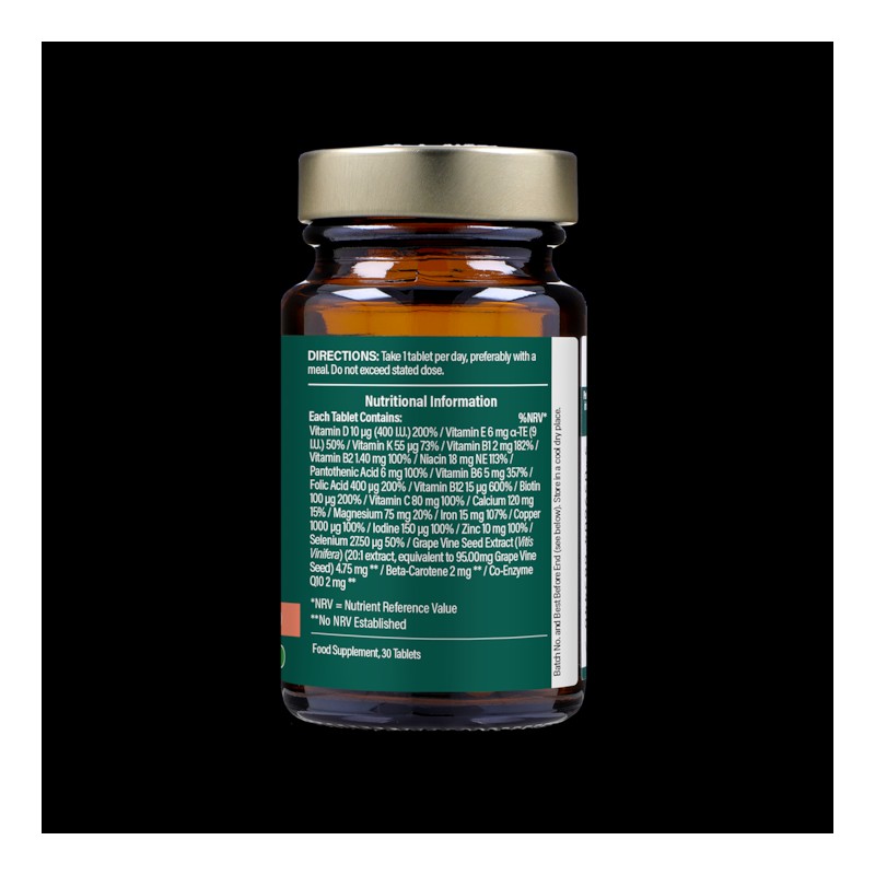 Bulking Agents (Microcrystalline Cellulose, Dicalcium Phosphate), Calcium Carbonate, Magnesium Oxide, Vitamin C (L-Ascorbic Acid), Ferrous Fumarate, Zinc Citrate, Beta-Carotene, Niacin (Nicotinamide), Anti-Caking Agents (Magnesium Salts of Fatty Acids, Silicon Dioxide), Glazing Agents (Hydroxypropyl Methylcellulose, Hydroxypropyl Cellulose), Vitamin E (d-Alpha Tocopheryl Acid Succinate), Pantothenic Acid (d-Calcium Pantothenate), Vitamin B6 (Pyridoxine Hydrochloride), L-Selenomethionine, Vitamin D (Cholecalciferol), Grape Vine Seed Extract (Vitis vinifera), Cupric Sulphate, Vitamin B1 (Thiamin Mononitrate), Vitamin K (Phytomenadione), Co-Enzyme Q10, Vitamin B2 (Riboflavin), Humectant (Glycerol), Folic Acid (Pteroylmonoglutamic Acid), Potassium Iodide, Biotin (d-Biotin), Vitamin B12 (Cyanocobalamin).