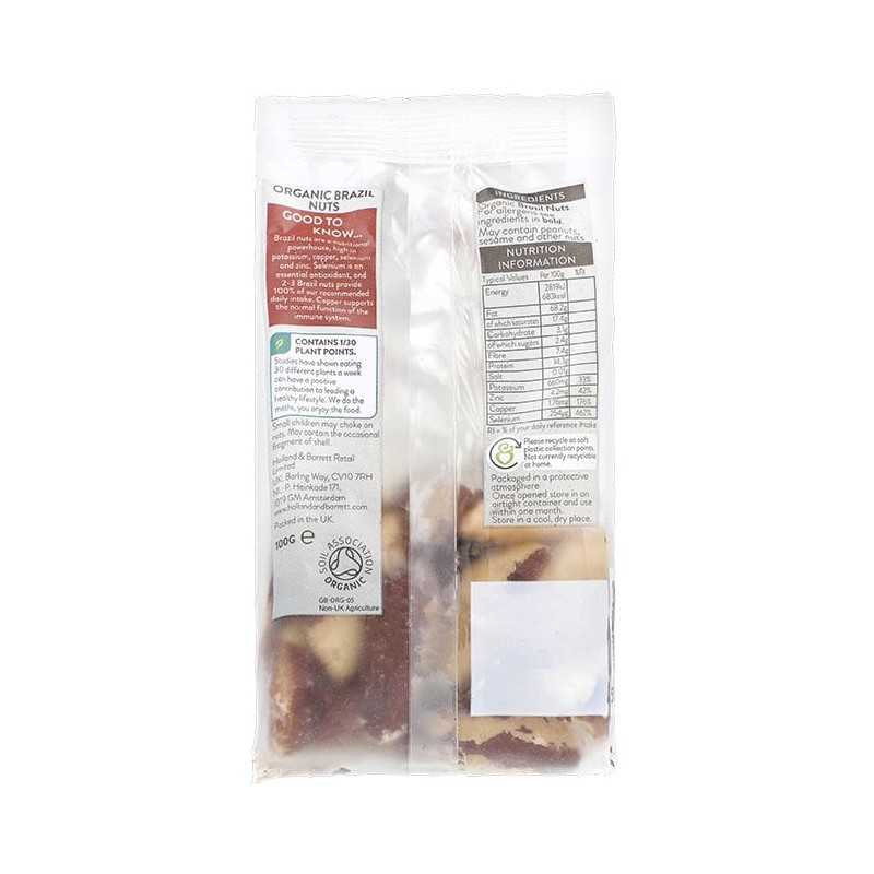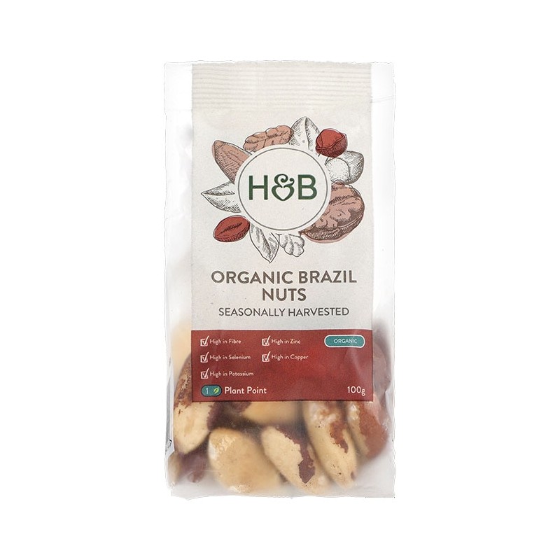 Holland & Barrett Organic Brazil Nuts provide antioxidants and minerals. They're particularly high in selenium, a mineral with antioxidant properties; just 2-3 Brazil nuts provide 100% of our recommended daily intake of Selenium. Our organic Brazil nuts are seasonally harvested.