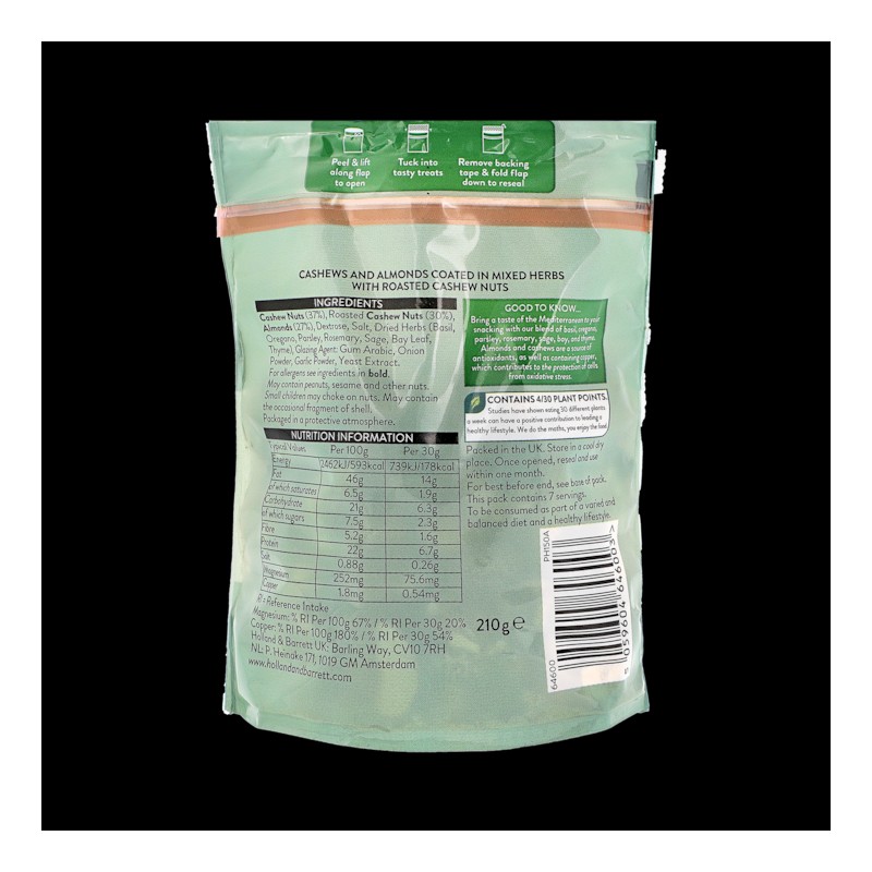 Bring a taste of the Mediterranean to your snacking with our blend of basil, oregano, parsley, rosemary, sage, bay, and thyme. Almonds and cashews are a source of antioxidants, as well as containing copper, which contributes to the protection of cells from oxidative stress.