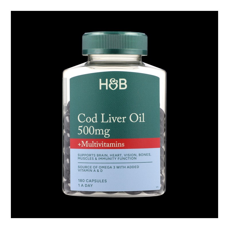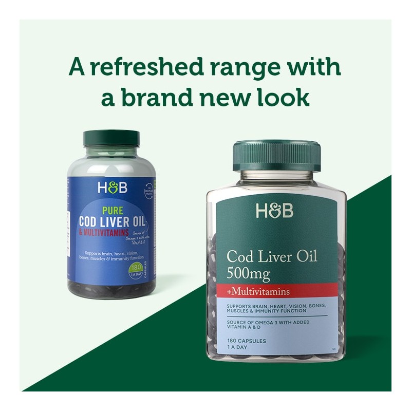 Holland & Barrett's Pure Cod Liver Oil is high in essential omega-3 fatty acids and is also an excellent source of Vitamins A and D. Our capsules contain the essential fatty acids DHA and EPA, which contribute towards the maintenance of normal brain function and vision and to the normal function of the heart.