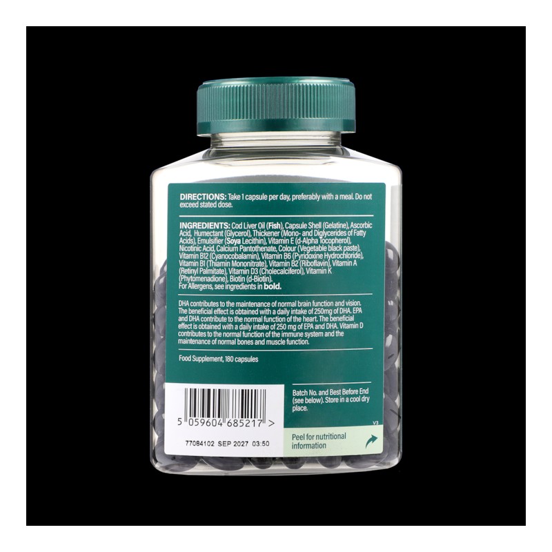 Cod Liver Oil (Fish), Ascorbic Acid, Capsule Shell (Gelatine), Capsule Shell (Gelatine), Humectant (Glycerol), Thickener (Glyceryl monostearate 40-50 E471), Emulsifier (Soya Lecithin (Soya)), Vitamin E (d-Alpha Tocopherol), Nicotinic Acid, Calcium Pantothenate, Colour (Vegetable black paste), Vitamin B12 (Cyanocobalamin), Vitamin B6 (Pyridoxine Hydrochloride), Vitamin B1 (Thiamin Mononitrate), Vitamin B2 (Riboflavin), Vitamin A (Retinyl Palmitate), Vitamin D (Cholecalciferol), Vitamin K (Phytomenadione), Biotin (d-Biotin).