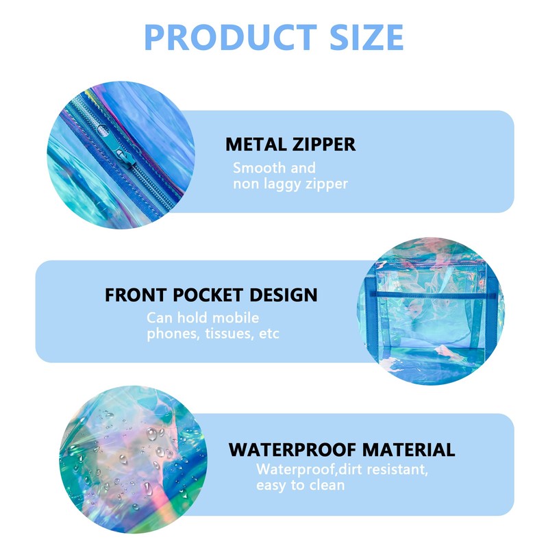 Holographic Clear Beach Bag with Zipper -13.78 x 10.6 x 5.9 inches Waterproof TPU Tote for Women, Travel & Pool Accessories for Beach, Pool, Travel, Cruise, Gym(1-Pack)