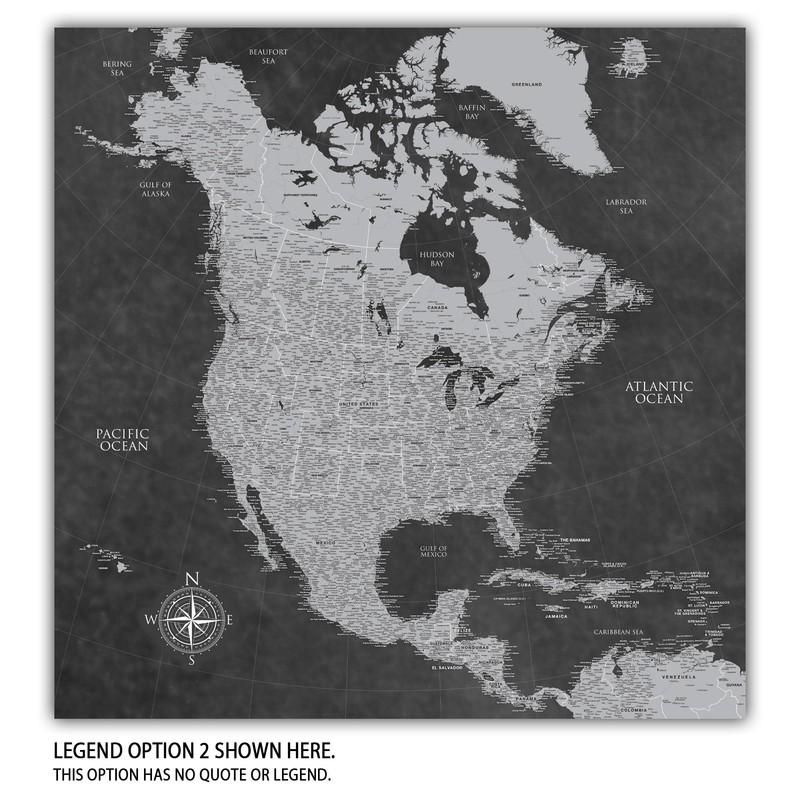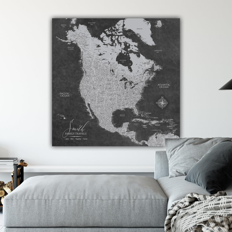 - RECORD YOUR TRAVELS & PLAN UPCOMING TRIPS with this beautiful pin board wall map. Grey North America travel map printed on premium canvas with a smokey background. Map features superb clarity with excellent city and country details.