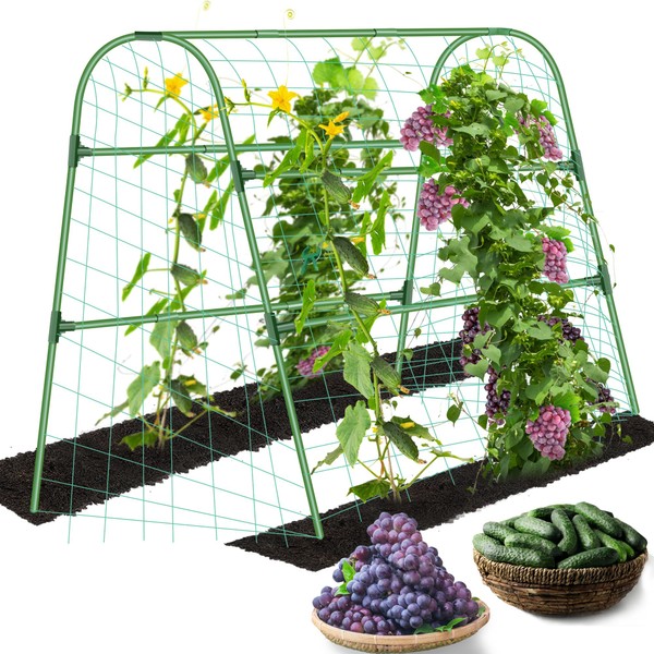 HolyMaji Cucumber Trellis for Raised Garden Bed, 49 x 47 Arch Trellis for Climbing Plants Outdoor Steel PE-Coated Detachable Garden Tunnel with Netting for Grape, Tomato, Squash, Zucchini