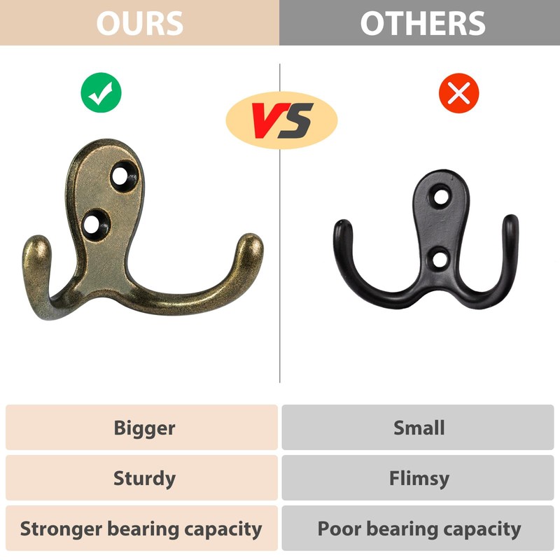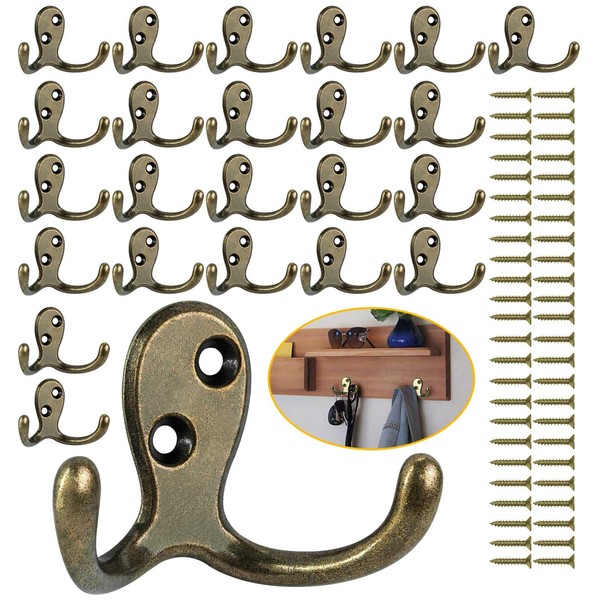 - Homanu 24 Pack Coat Hooks, Heavy Duty Double Prong Coat Hooks Wall Mounted with 48 Screws, No Rust Antique Brass Metal Wall Hooks for Hanging Towel, Coat, Bag, Hat, Cup, Key
