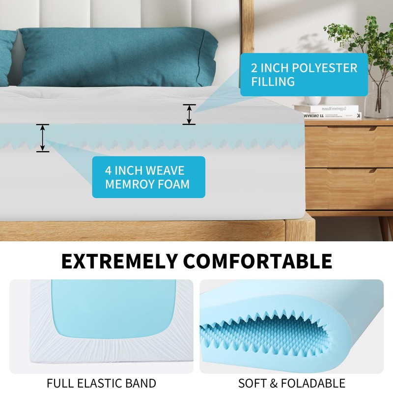 - 【6 Inch Thick Dual Layer Mattress Topper】 - King size : 80x78 in.This plush mattress topper features 4 inches of memory foam and 2 inches of quilted breathable pillow top mattress topper with Polyester fiber filling. When combined, it transforms into a 6-inch thick mattress cover that is not only highly supportive, but also provides a cloud-like comfort experience