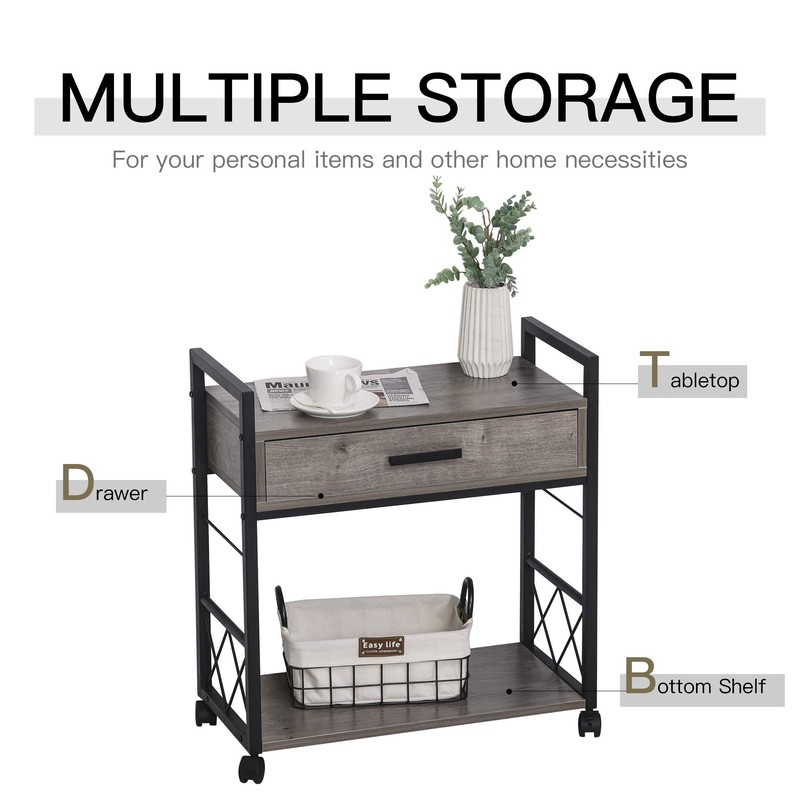 HOMCOM Industrial End Table with Drawer and Bottom Shelf, Mobile Side Table with 4 Wheels for Living Room,Grey