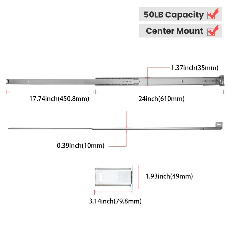 • Measurements: Length:24 inch(610 mm); Maximum length of full Extension:41.74 inch(1060.8 mm); Width:1.37 inch(35 mm); Thickness:0.39 inch(10 mm); Load-bearing capacity:50 LB. Please choose the right size before you purchase our heavy duty drawer slides