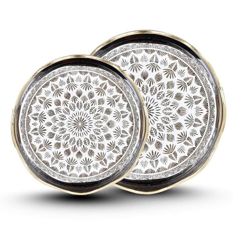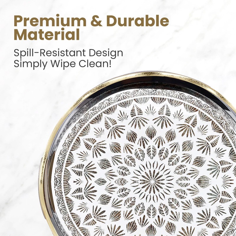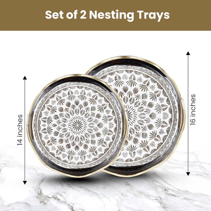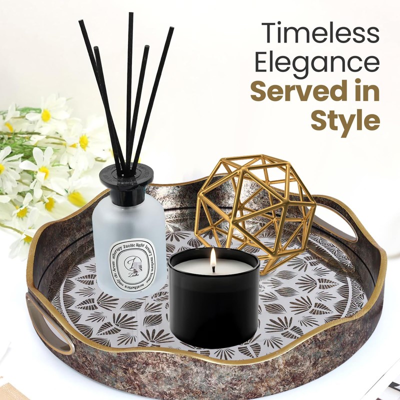 HOME ARCHIVE Round Serving Tray with with Handles Antique Look & Stylish Design Decorative Trays for Kitchen Round Ottoman Tray for Dinning Living Room & Home Decor Pack of 2 (Black-Gold)