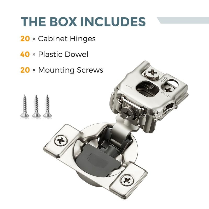 - Complete Set of Accessories: The package includes 20 hinges, 40 plastic dowels, and 20 mounting screws, fulfilling installation needs.