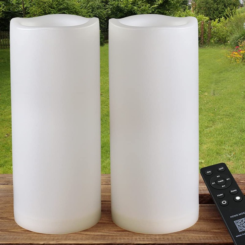 - 4 X 10 LARGE REALISTIC LED PILLAR CANDLES OUTDOOR - Designed with natural-looking wavy edges and wax-like textured WHITE body, these LARGE 4 X 10 LED pillar candles provide the realistic and rustic look & feel for a big yard, especially when they come in pairs. - IP65 waterproof, designed to withstand hot weather, heavy rain, mist and water spills. - The vivid flickers in BRIGHT WARM WHITE glow give the real look as burning candles, creating a serene and romantic ambience.
