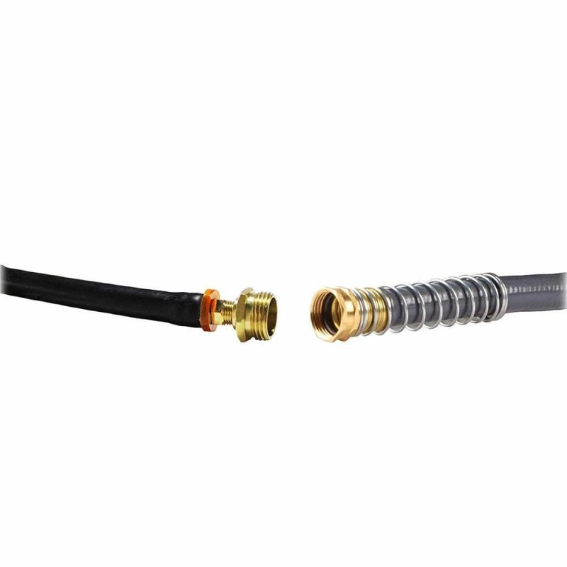 Flexible hose allows the adapter to access tight spaces and minimizes stress on pipes and fittings. Pre-assembled length: 11.5 inches approx. Pressure rating: 250 psi. 100% outdoor rated, virtually indestructible, impervious to water and oil.