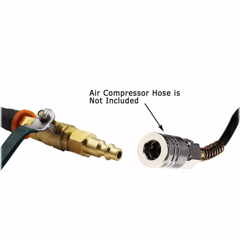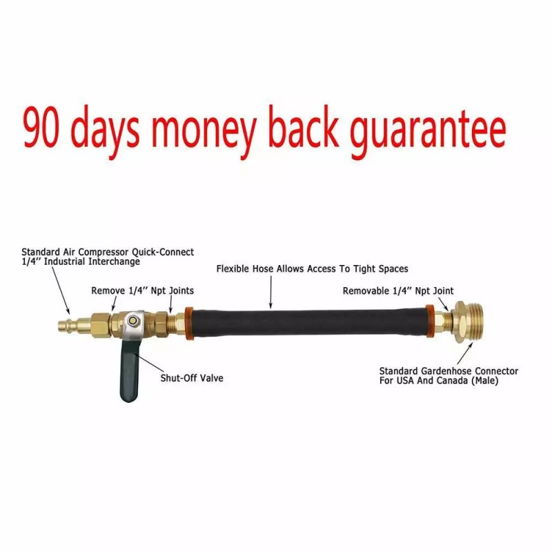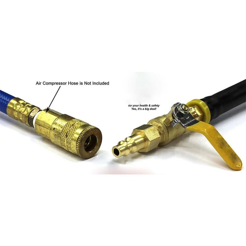 A quick and easy way to blow out the water lines of your RV, motorhome, camper, boat, and travel trailer. Winterizing is easy with this blow out adapter. Its 3/4"-11 NH hose threads easily connects to a standard garden hose. Its 1/4" Industrial Interchange Quick-connect plug is the most common quick-connect fitting for air compressors in North America. One end of the adapter has a male garden hose faucet/spigot/spout connection which screws directly to the city water inlet on your RV, motorhome, boat or travel trailer. The other end of the adapter has a quick-connect plug designed to connect to most air compressors. If your compressor does not have quick-connect coupler, you can easily remove the quick-connect plug with a wrench to get access to the 1/4" male NPT (national pipe thread) connection, which is a very common connection. Your local hardware store should be able to help you find the proper adapter to connect the 1/4" male NPT to your air compressor. The flexible hose allows the adapter to access tight spaces and minimizes stress on your piping and fittings. We use food-grade vegetable oil and non-toxic plumber's pipe dope only in the installation process.