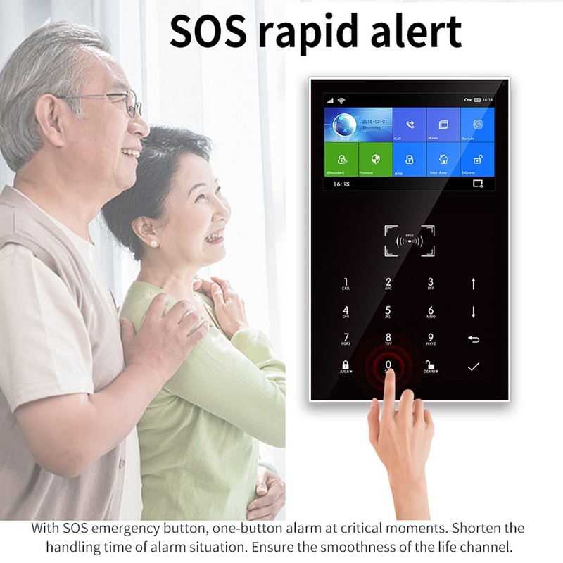 - Full Touch Key: The alarm adopts embedded operating system, ARM9 CPU high performance operation, 4.3 inch HD capacitive screen touch screen, display more intuitive more convenient, touch dustproof keyboard, two way voice intercom function, easy control for the elderly and children, providing intelligent life.