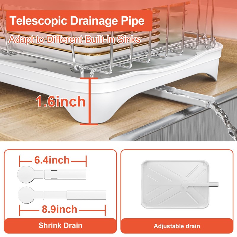 - [Self-draining in seconds, 0 residual water on the countertop] Kitchen dish drying rack integrated sink design, water tray directly connected to the drain, water droplets automatically into the sink, the drainage area and the physical isolation of the countertops, eliminating the accumulation of water and mould hidden danger, cleaning efficiency increased by 70%, all-weather to keep the kitchen dry