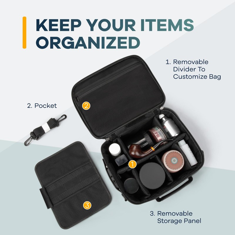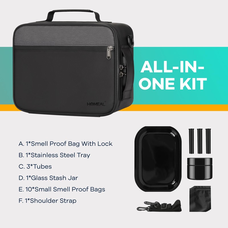 - LARGE SMELL PROOF BAG KIT: This smell proof bag kit comes with 1 smell proof bag with lock,1tray, 1 jar, 10 small smell proof bags, 3 tubes to save your time and money. We offer one adjustable shoulder strap and comfortable handle give you two options to carry. The smell proof stash bag is ideal smell proof box for personal items, strong smell stuff and travel items.