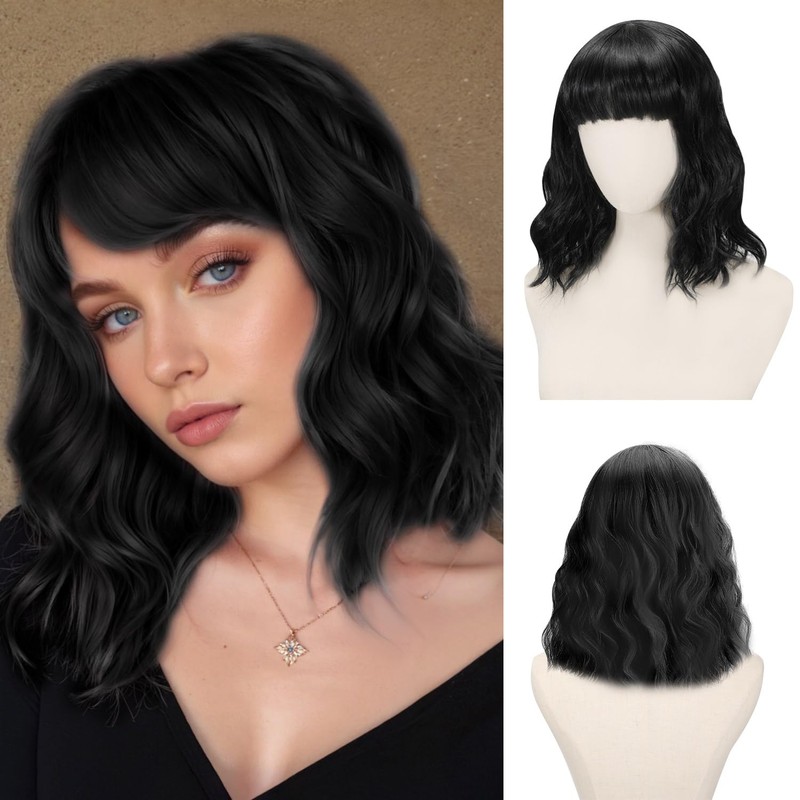 HomeChi Peluca Ondulado para Mujer, Peluca Sintética Natural Hasta Los Hombros, Peluca Rizada Suave y Transpirable con Flequillo para Cosplay Diario Navidad Cumpleaños Fiestas, Negro