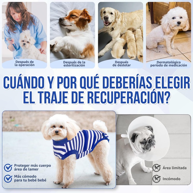 - Evita que se laman o rasquen la herida --- El traje de recuperación posquirúrgico ayuda a prevenir que su amigo peludo se lama o se rasque las heridas quirúrgicas, lo que puede reducir el riesgo de infección y más lesiones. Es ideal para postoperatorios, castración, medicación para la piel y destete.