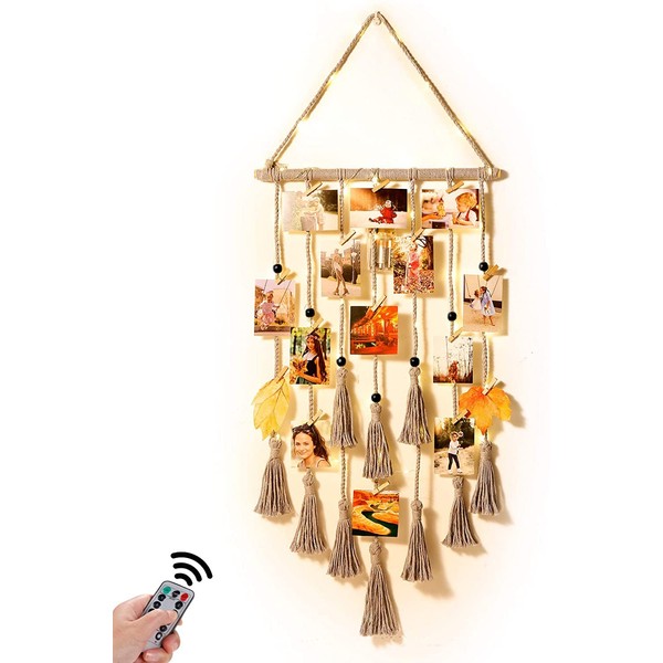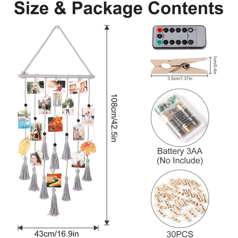 Homecor Hanging Photo Display Wall Decor, Gray Macrame Wall Hanging Boho Room Decor, Picture Frame Collage Board with Remote Light 30 Clips, Bedroom Home Decor, Christmas Mom Grandma Teen Girl Gifts