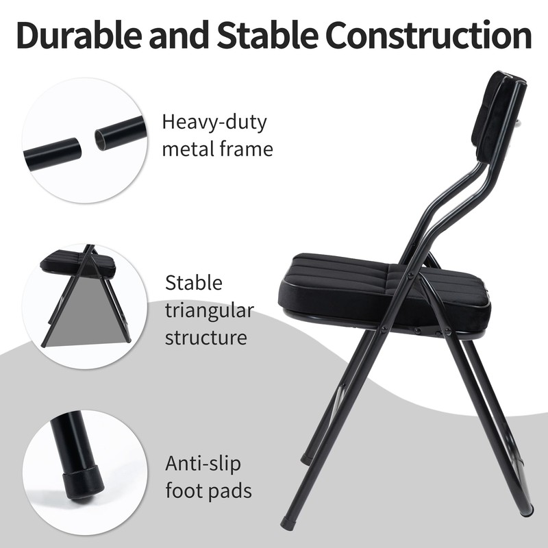 - Upholstered Seat and Backrest: The folding chairs with padded cushion and backrest which will relieve pressure on hips and back. For a more comfortable sitting experience. Skin-friendly and breathable velvet fabric