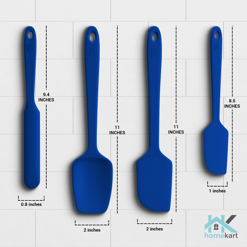 - Presented in premium packaging, they make a versatile and stylish addition to any kitchen. The 4-piece set includes Large, Mini, Spoonula, and Jar Spatulas in Blue color equipped with a strong handle for heavy-duty tasks and a soft head tip suitable for non-stick cookware.