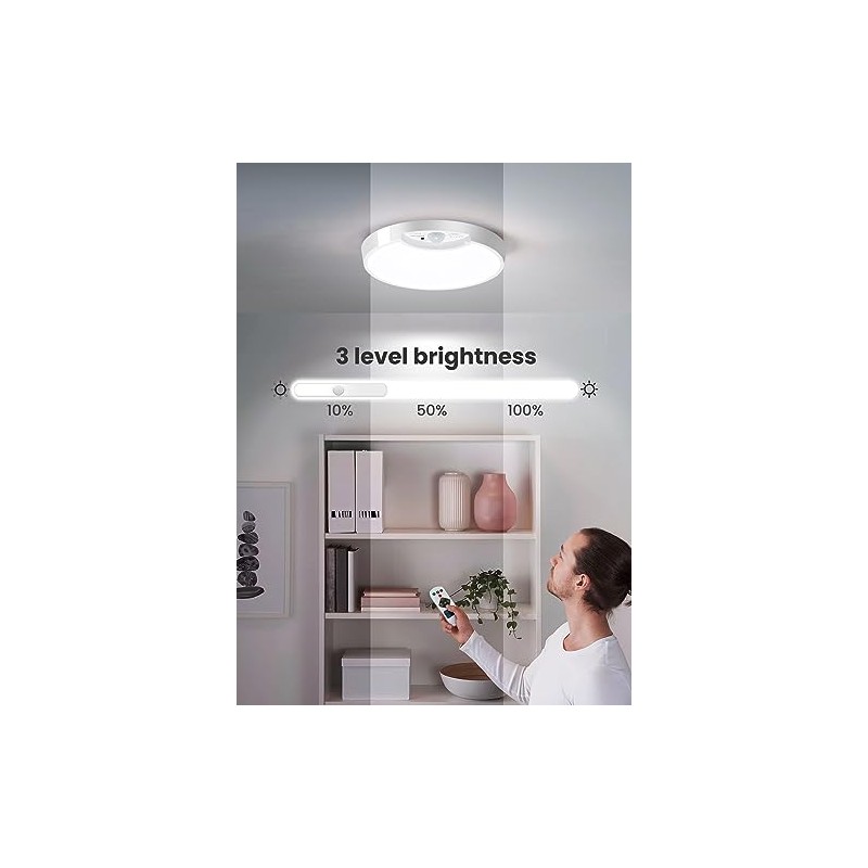 - Adjustable Brightness-Dimmable Ceiling LightWith 400 lumens/6500K color temperature, this dimmable ceiling light is enough bright to fit any dark areas. This motion sensor light has three-block dimming, high-medium-low, brightness is 10%, 50%, 100%, you can choose the confortable brightness by yourself