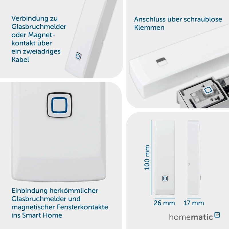 - Compact contact interface for integrating wired glass break detectors, magnetic contacts or other contacts into the Homematic IP smart home system.