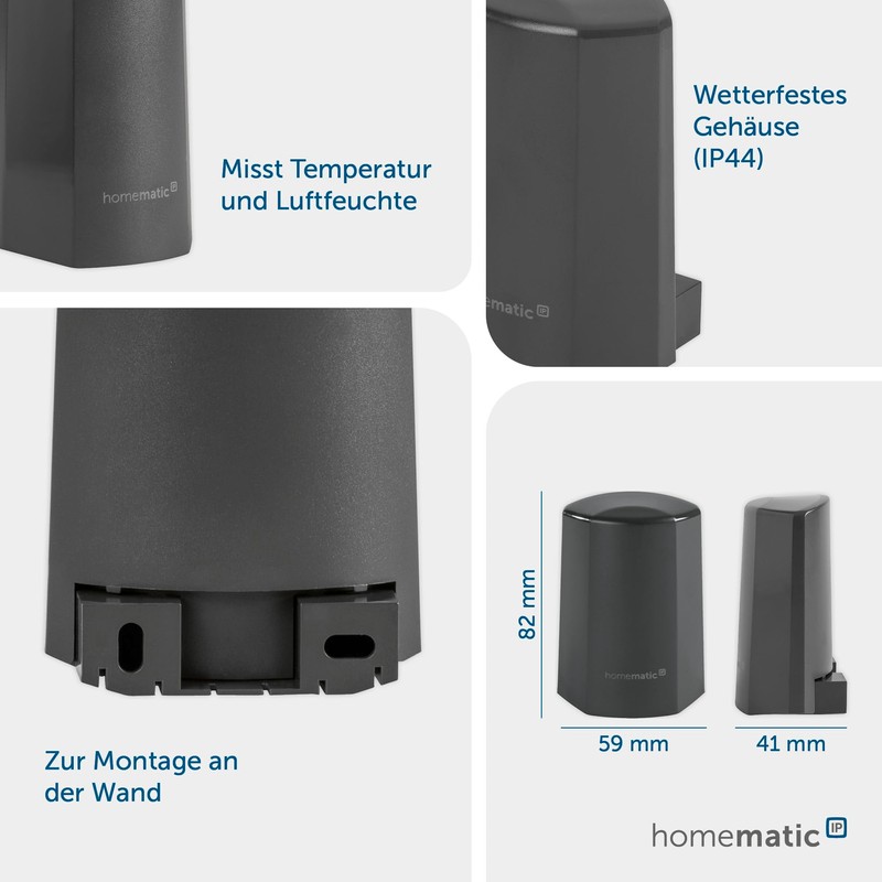 • Measures temperature and humidity outdoors and displays the weather data determined via the free Homematic IP app.