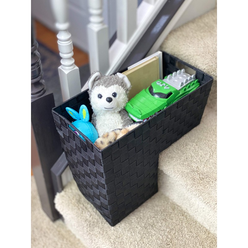 Clutter no more! Keep a step basket neatly on your steps to keep all clutter out of view. Easily carry the basket up or down the stairs and “unload”. Allow your steps to be a practical and beautiful part of your home. Our unique nylon-woven baskets are melded from durable iron and designed with handles within the actual frame to provide superior quality. These baskets were tried and tested for optimal functionality to withstand normal household use Compact and shaped to fit most stairs with one shallow and one deeper compartment.