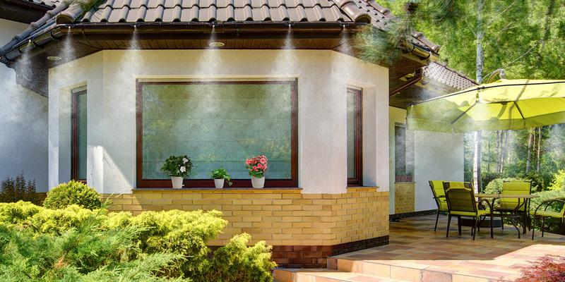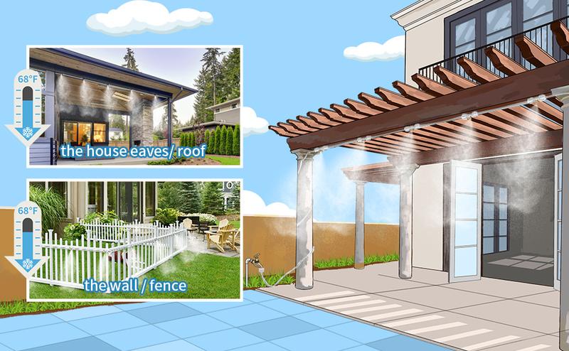 Install the misting system on the house eaves, the roof, the entrance portico, the undercover patio, the fence, the courtyard wall, and so on, to cool your house patio.