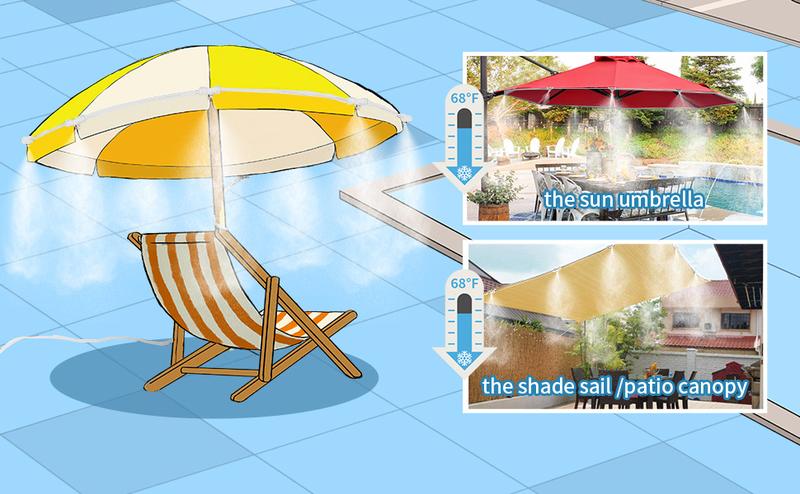 When hanging the mister system on the sun umbrella, shade sail, patio canopy, swimming pool, it will give a cool breeze to the pool area.