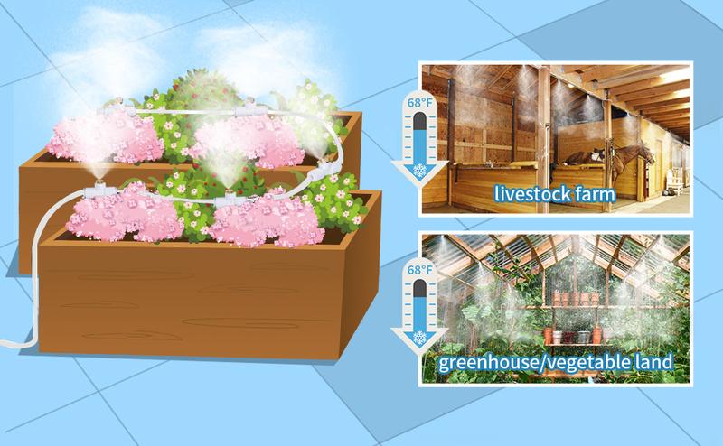 Watering by misting can cover a more large area than traditional watering, giving a uniform water volume for plant watering in the garden, vegetable land, landscaping, greenhouse, giving continuous misting water for cleaning and cooling in livestock farm.