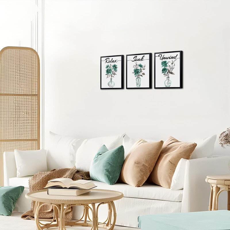 HOMEOART Bathroom Wall Art Relax Soak Unwind Bathroom Laundry Room Decor Sign Floral Art Prints, Set of 3, Black Frame 12x16 inch (Green)