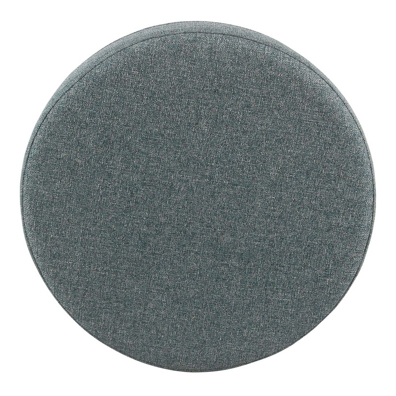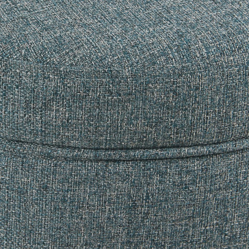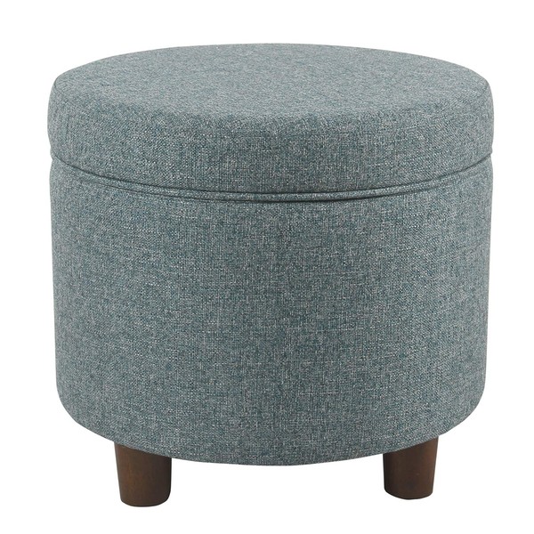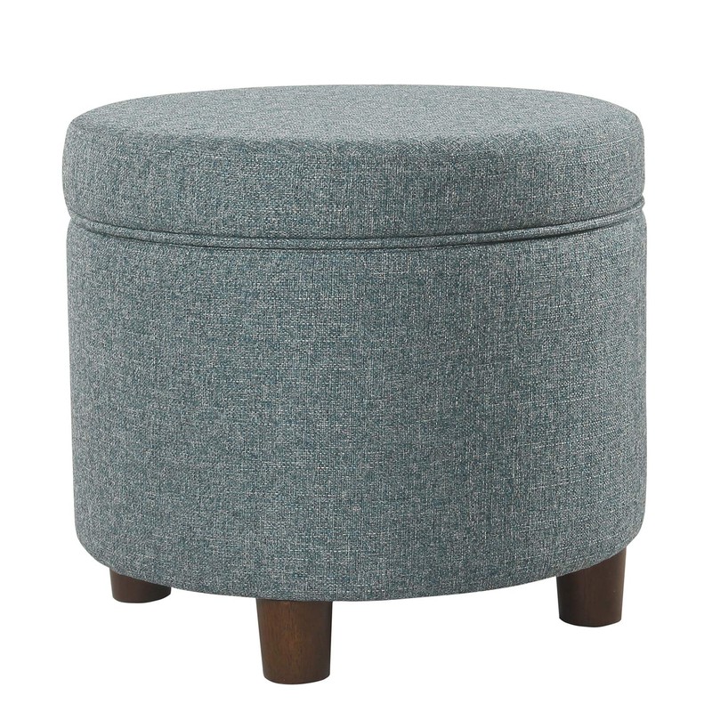 This modern round ottoman features a lift-off lid for convenient storage. Upholstered in textured tweed fabric with welting on the lid, this mid-century ottoman has wood legs in a complementary finish. Use this multifunctional storage ottoman to hide accessories in a bedroom, to store books or magazines in a living room, or to keep controllers or remotes nearby but out of sight in a family room. Pair two together for added impact. This ottoman is available in a variety of colors and is easy to assemble and maintain.
