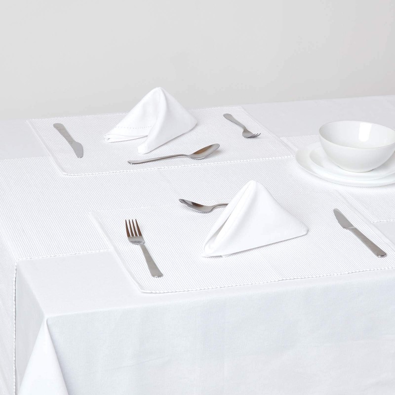 - A set of four 100% Cotton Napkins 18x18 Inch or 45x45cm in White colour. Coordinating tablecloth, Runners, Napkins and seat pads available with Homescapes.
