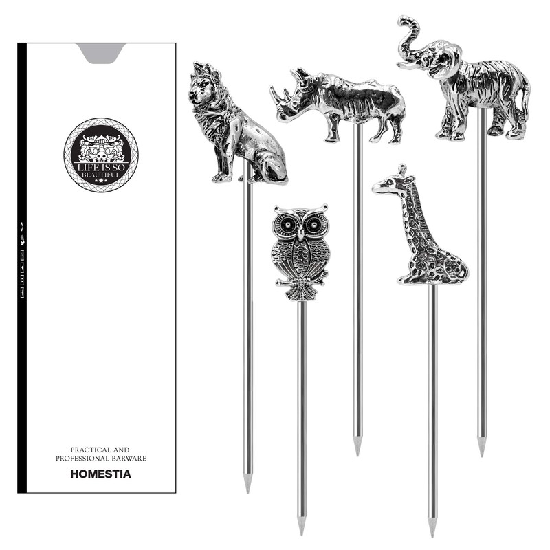 - CREATIVE TOPS - This cocktail garnish pick set includes 6 Pcs skewers, with solid headpieces, lifelike leopard, zebra, elephant, lion, rhino and giraffe. A beautiful cocktail pick will make your garnishes better. Sophisticated finials, each one unique, make it easy to identify each guest's drink.