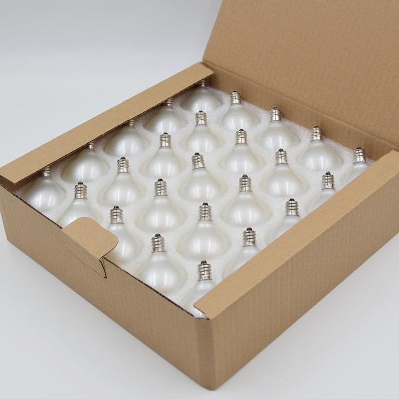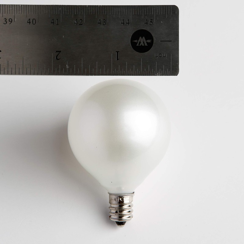 • Our G50 white satin pearl globe light bulbs are 0.6 watts each and 2" tall by 2" wide. They feature a high-quality nickel base and use 130 volts.