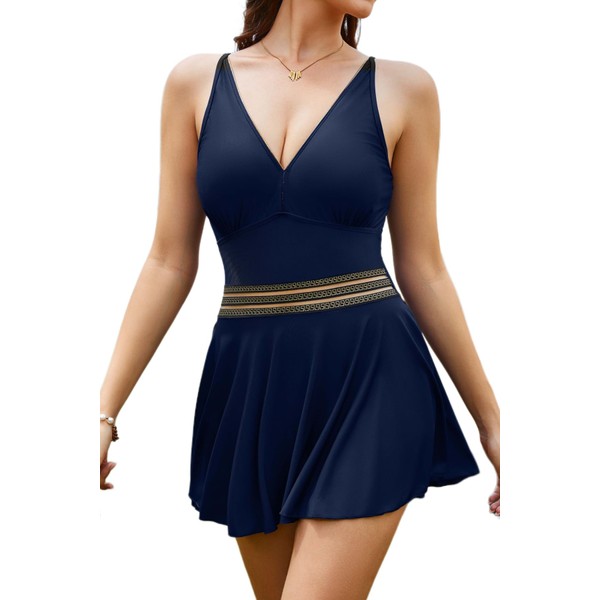HomeTzaryn Swimming Suits for Women V-Neck One-Piece Swim Dress Built-in Shorts Adjustable Straps Elegant Slimming Swimwear Blue