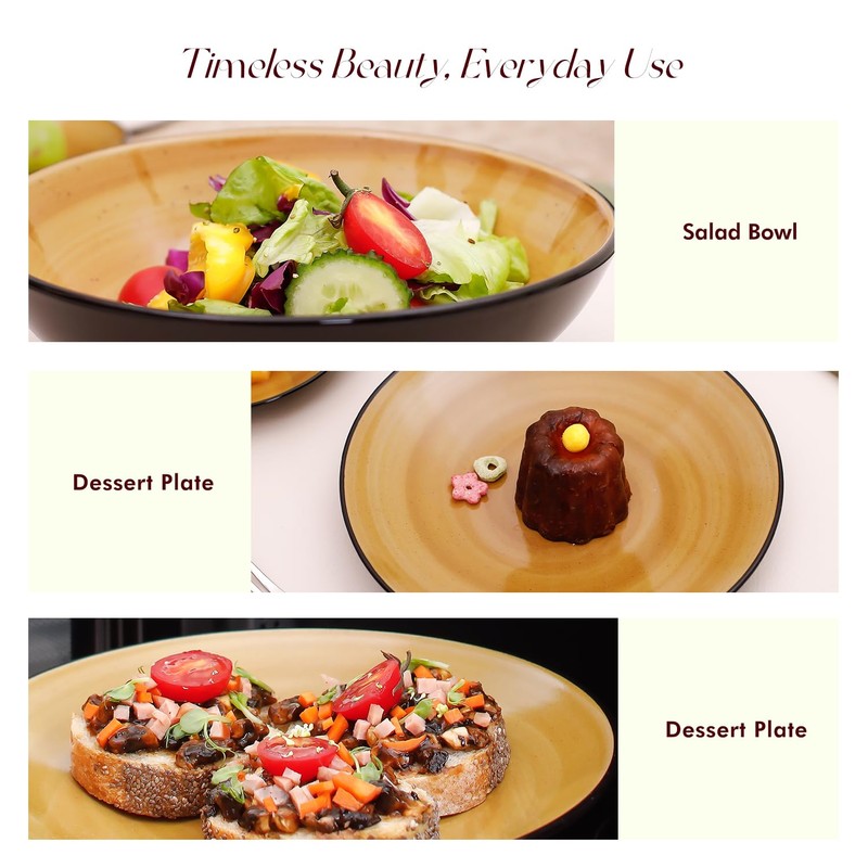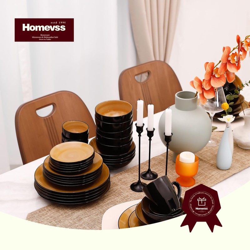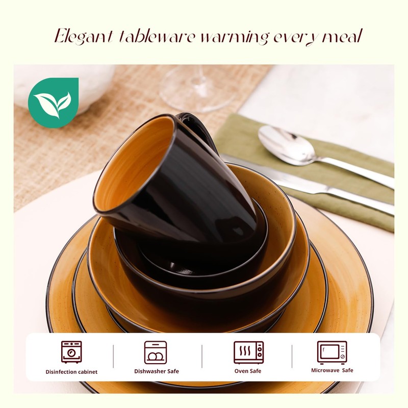 HomeVss Sonoma 16 Piece Stoneware Dinner Set, Outside Black + Inside Handpainted Color Yellow with speckle