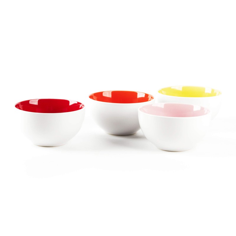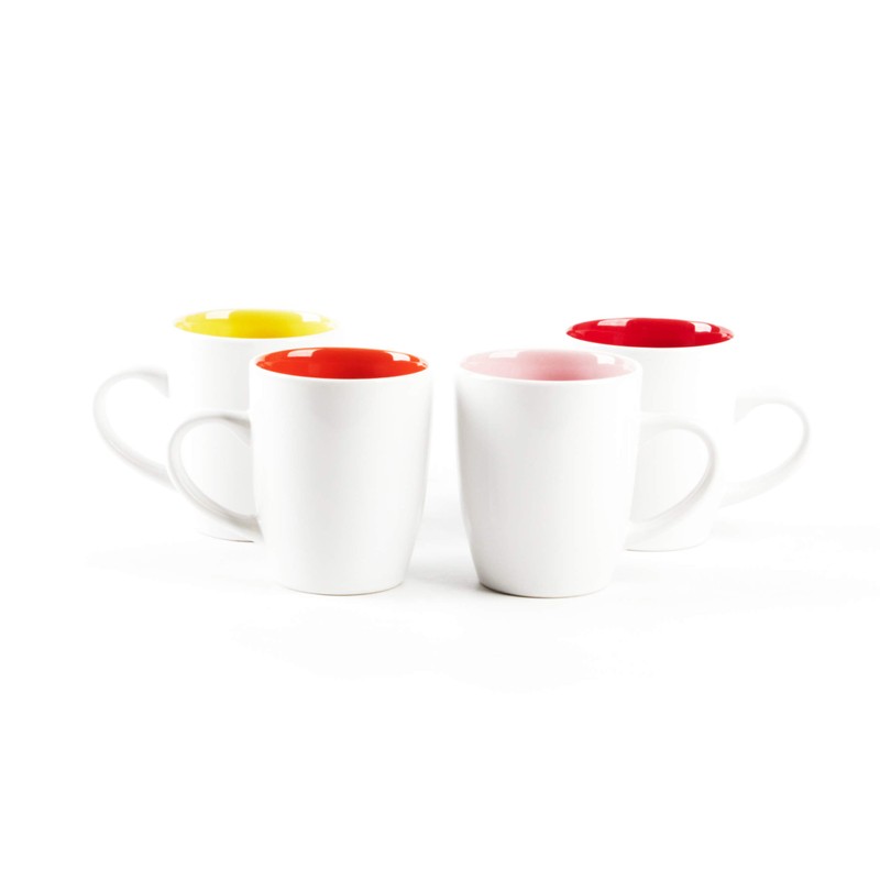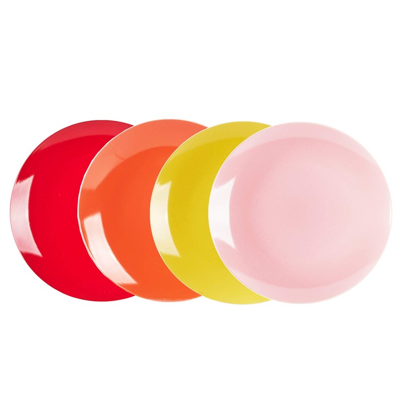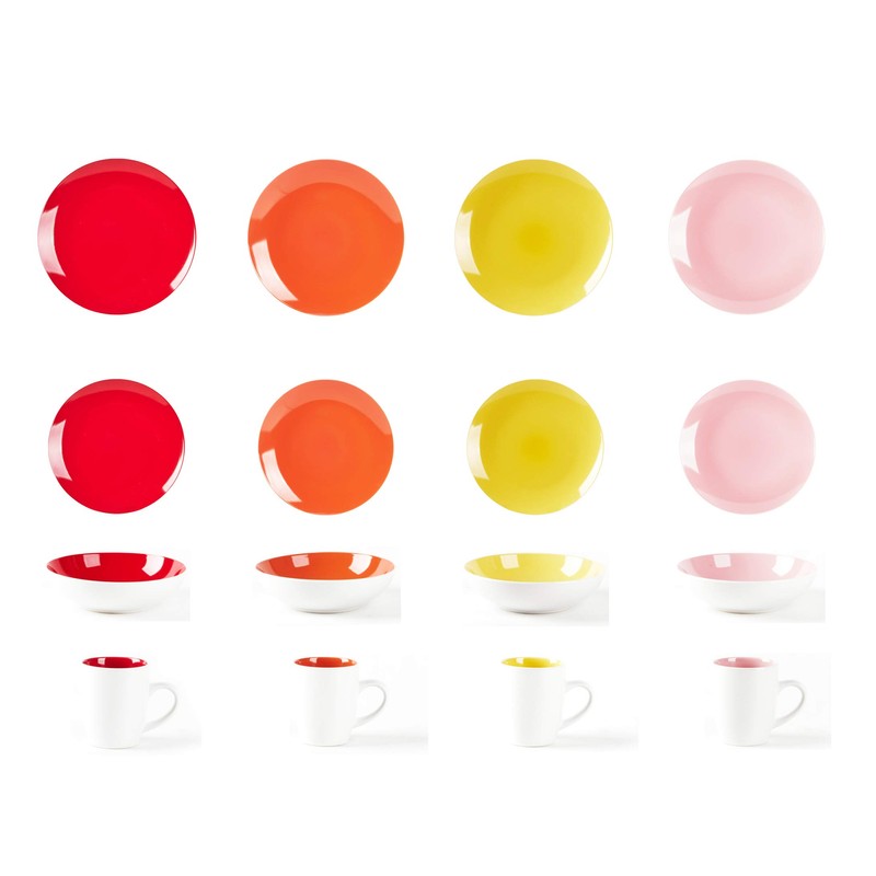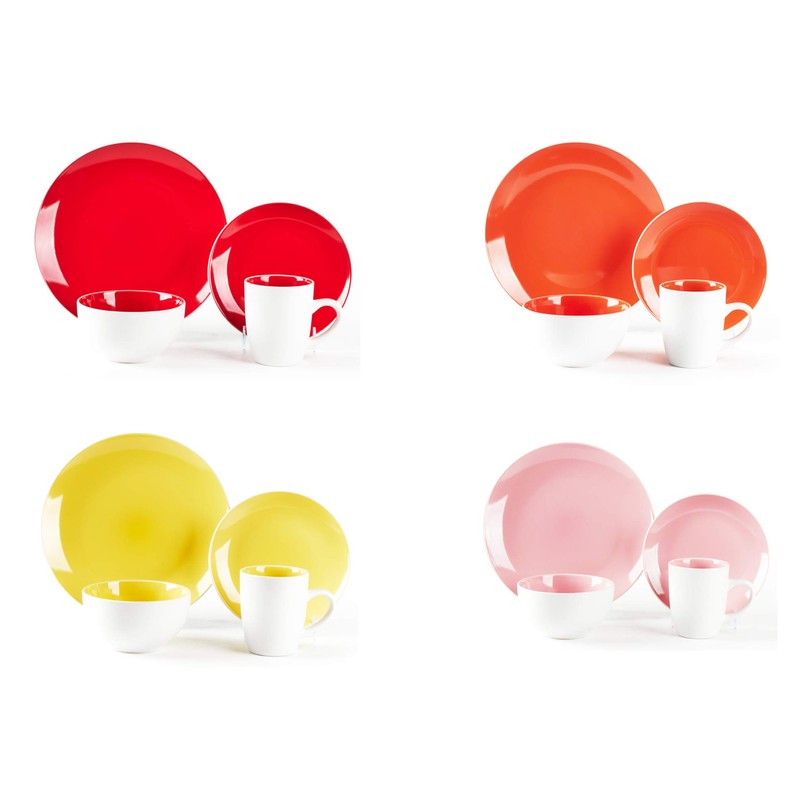 - 16pc Set Service for 4, Including 4 Piece of Following Each: Dinner Plate 10.5", Salad Plate 7.5", Cereal/Soup Bowl 5.5", Muggy13oz, in Assorted Colors of Rose, Red, Orange and Yellow, 1 Piece for Each Color