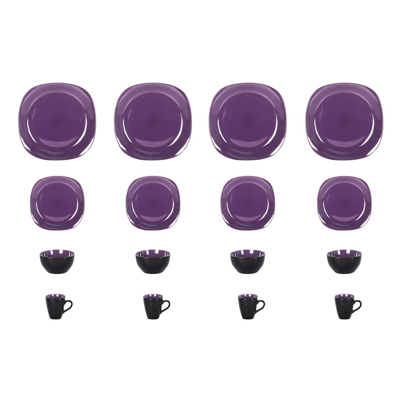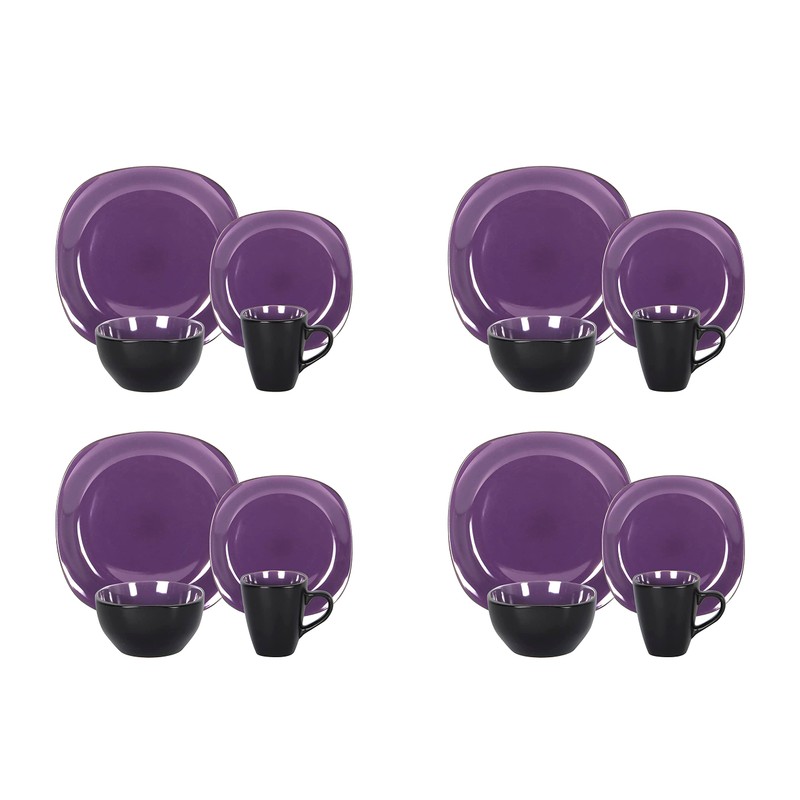 HomeVss, Stoneware Square 16pc Dinnerware Set, Inside Shiny Purple and Outside Matte Black